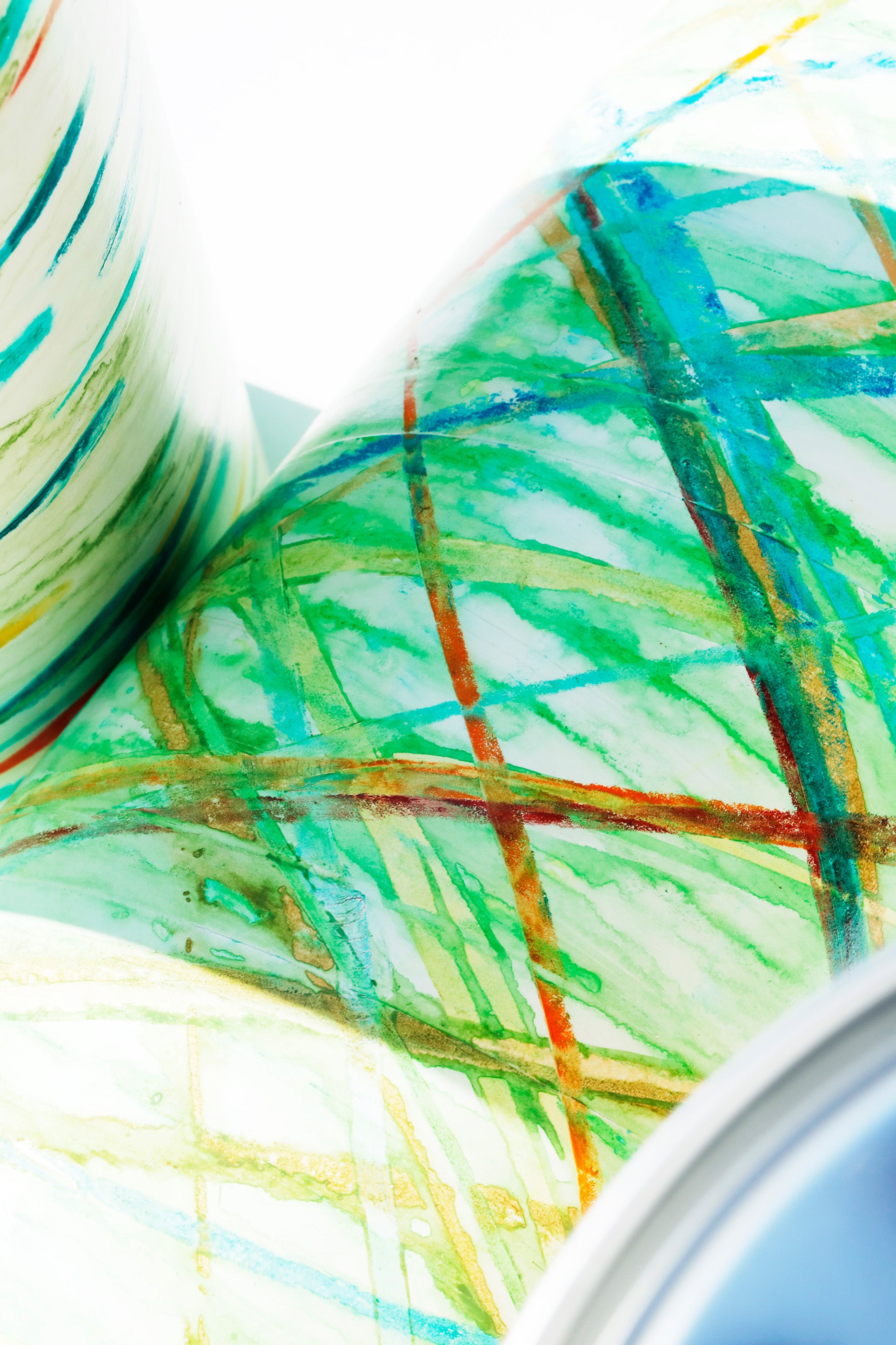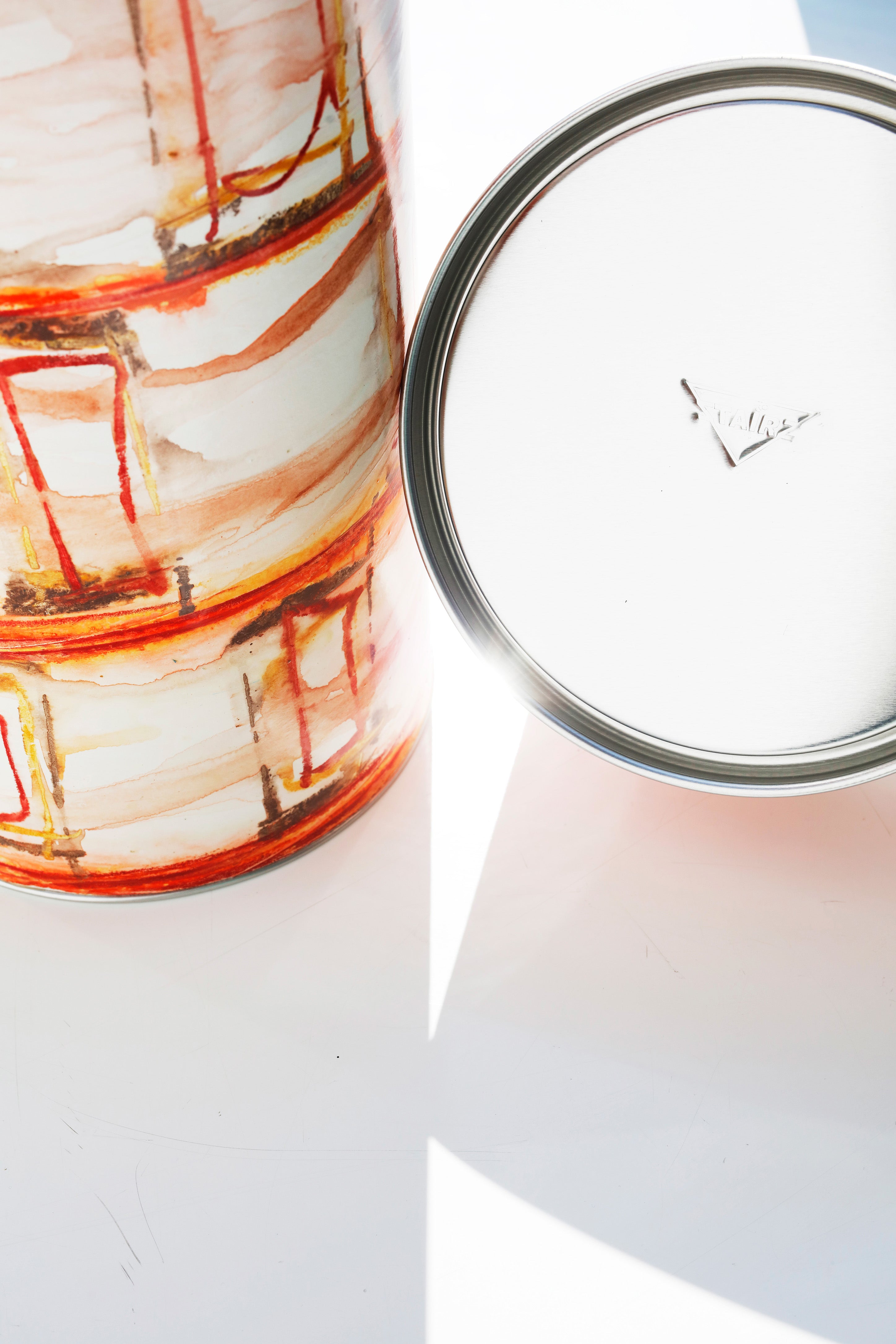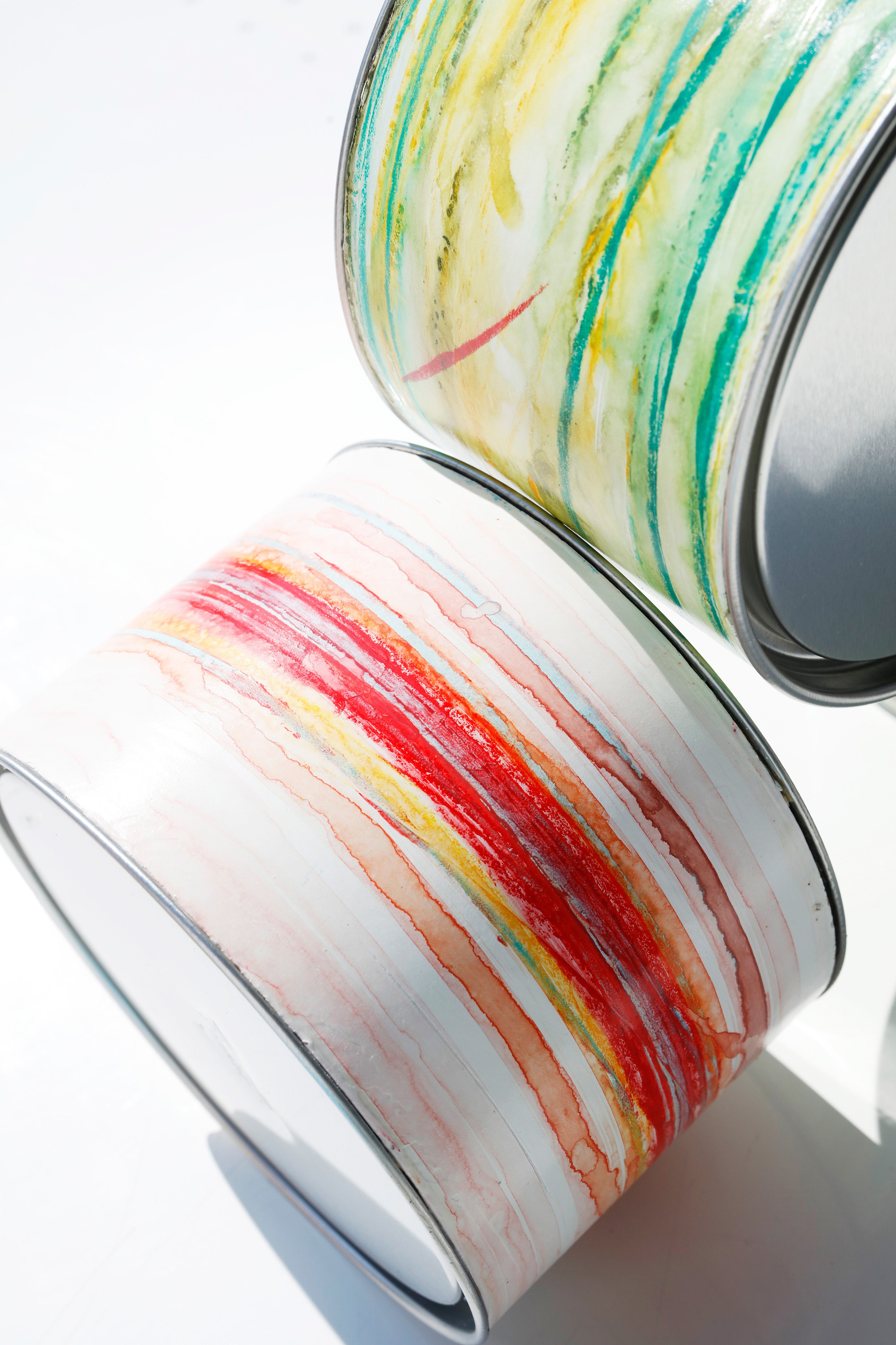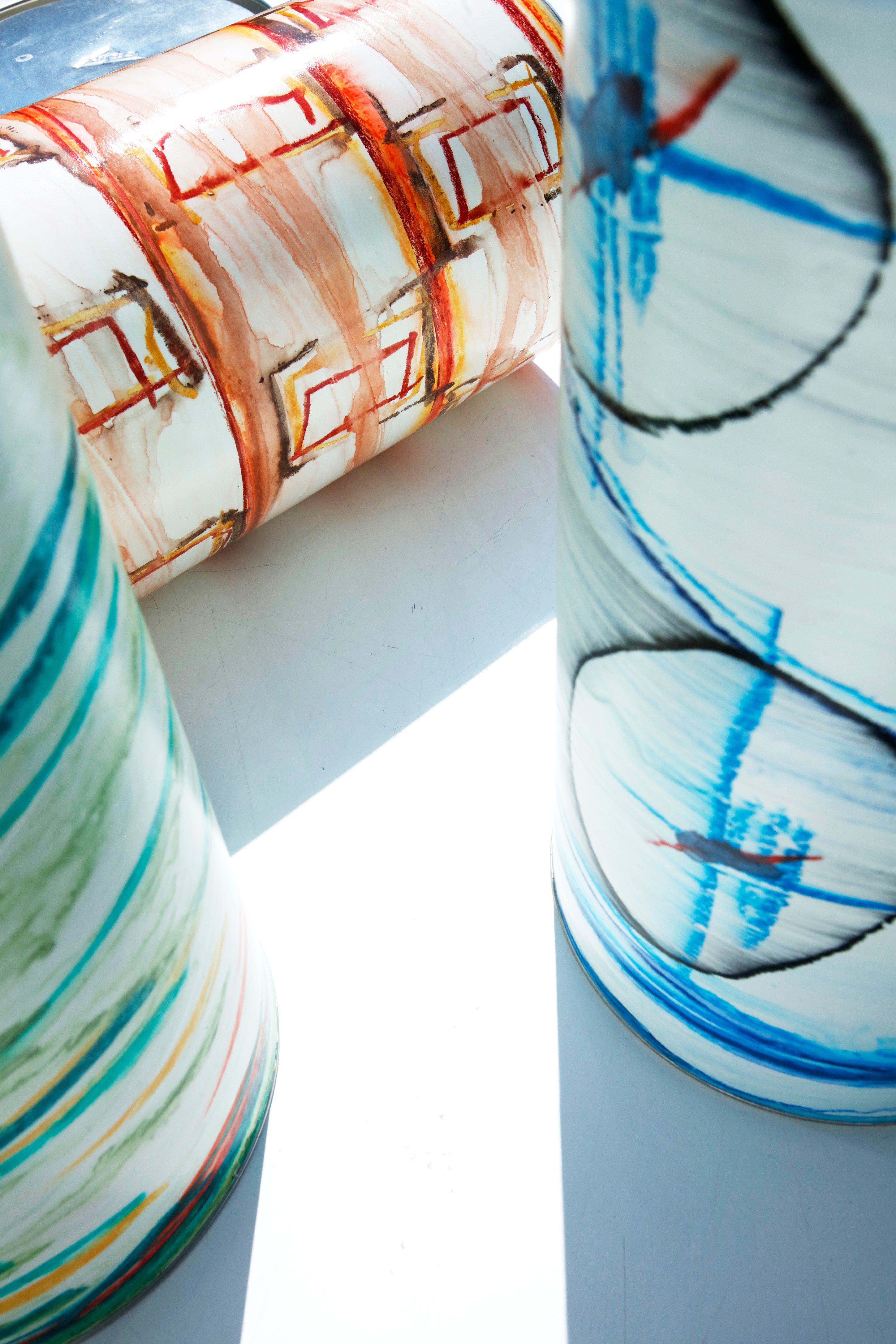 cartone pressato, dipinte a mano una per una con vernici acriliche. Ogni pezzo è unico, con motivi astratti o ispirati all’architettura, caratterizzati da colori intensi e combinazioni sorprendenti: dal rosso bruciato e ocra caldo, ai tocchi marini di turchese e verde, fino ai contrasti eleganti del grigio e nero con accenti blu. Disponibili in due formati, sono ideali per essere riutilizzate come contenitori decorativi o portaoggetti.