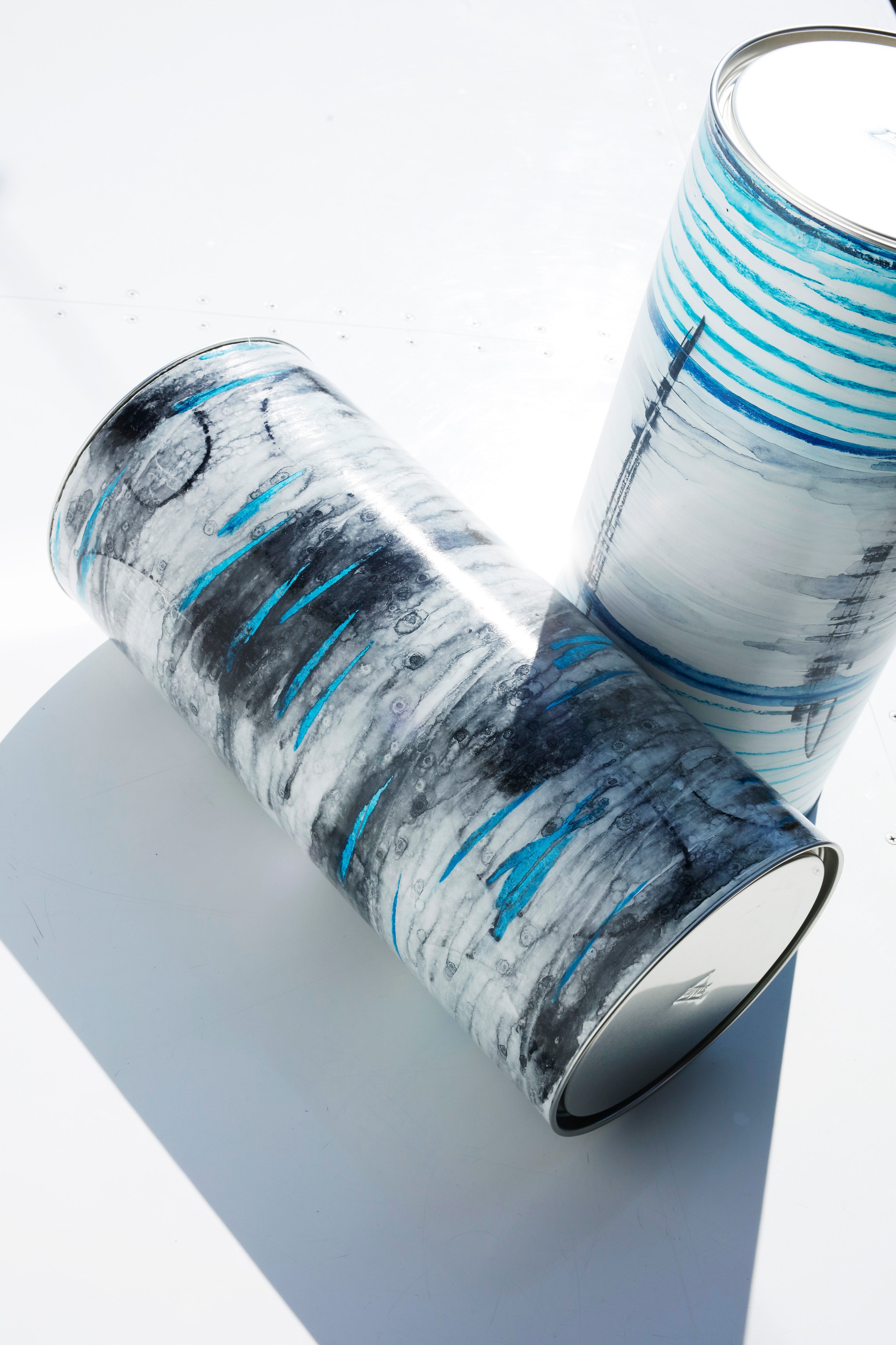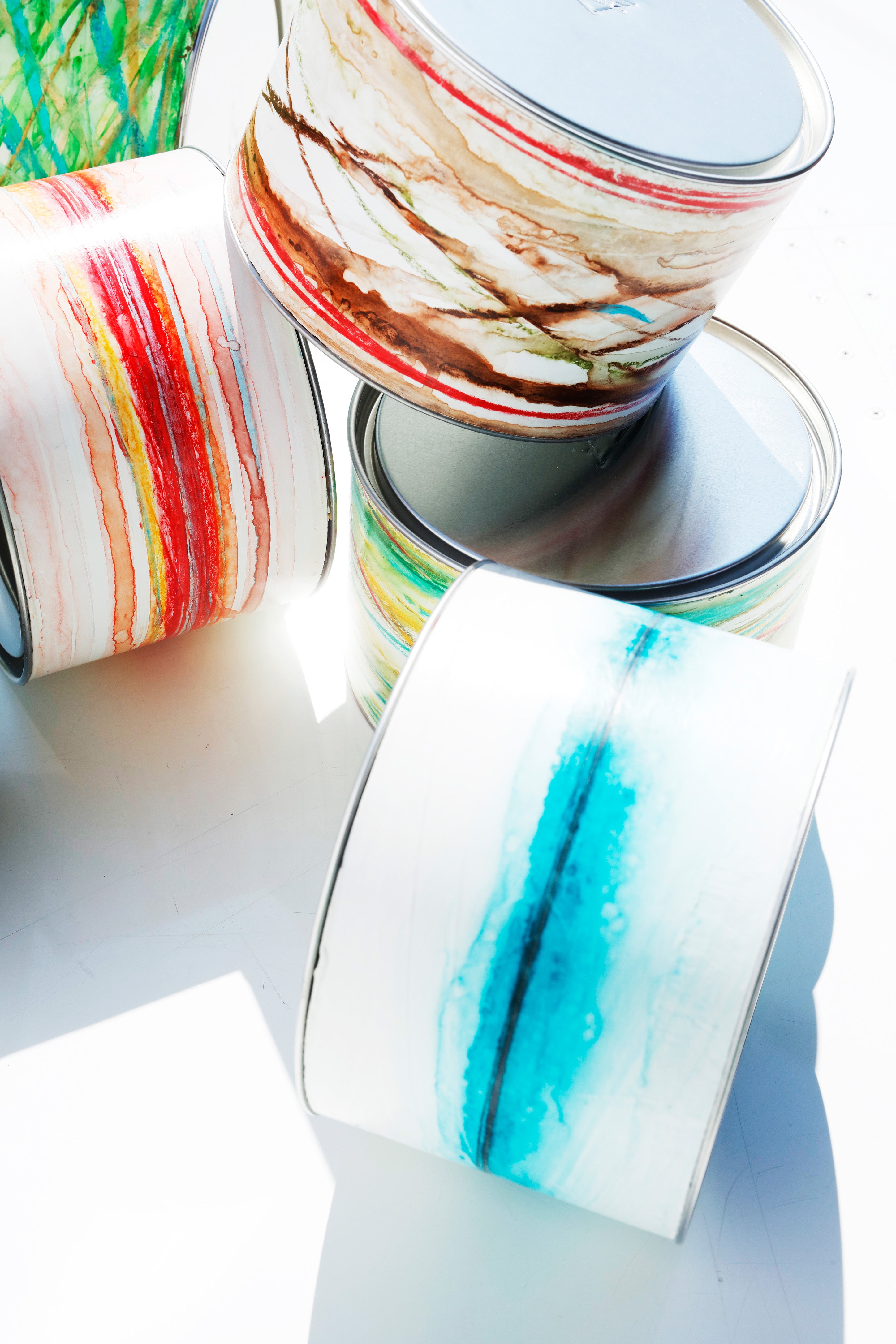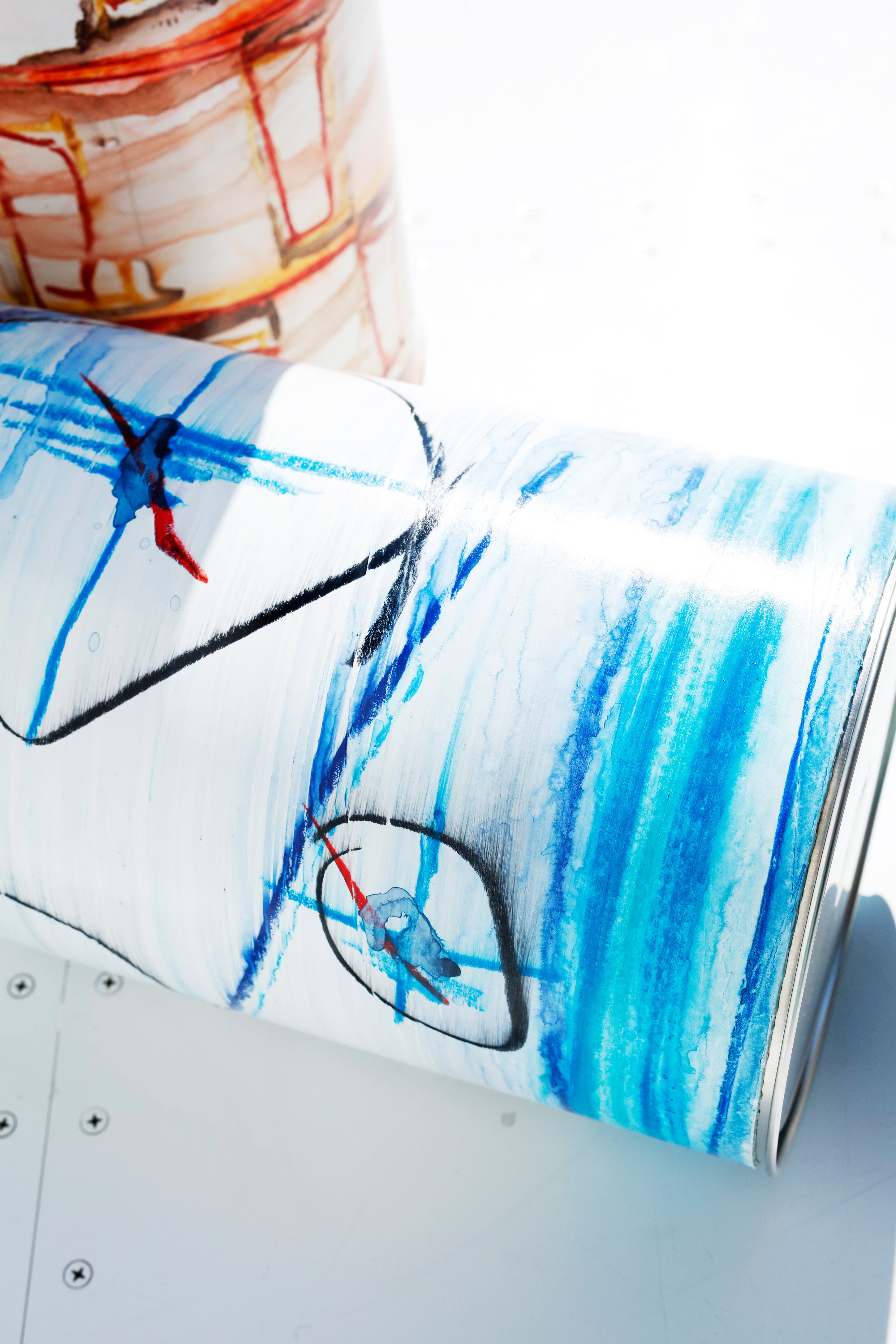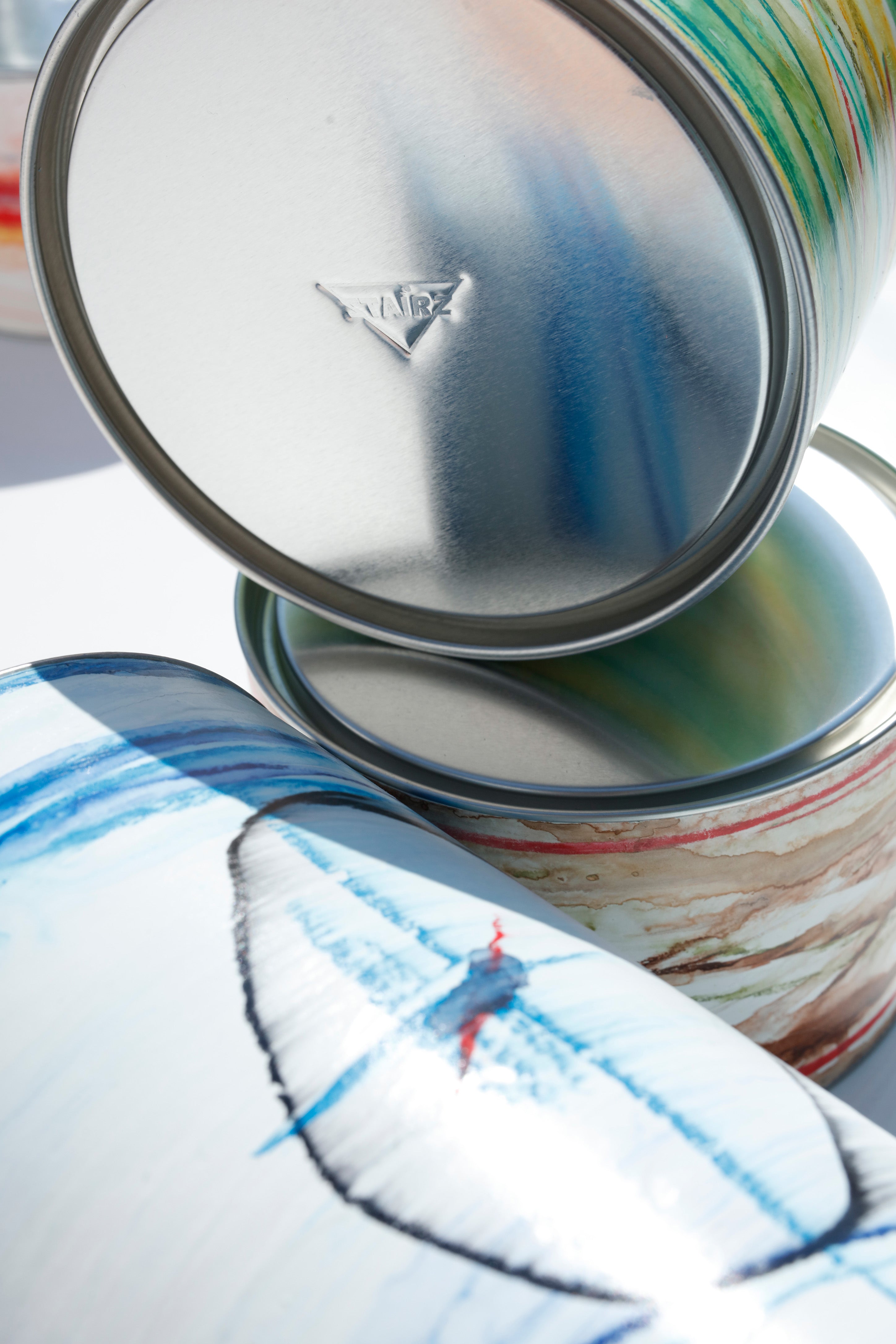 cartone pressato, dipinte a mano una per una con vernici acriliche. Ogni pezzo è unico, con motivi astratti o ispirati all’architettura, caratterizzati da colori intensi e combinazioni sorprendenti: dal rosso bruciato e ocra caldo, ai tocchi marini di turchese e verde, fino ai contrasti eleganti del grigio e nero con accenti blu. Disponibili in due formati, sono ideali per essere riutilizzate come contenitori decorativi o portaoggetti.
