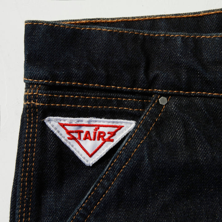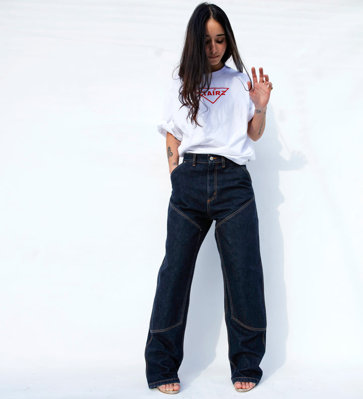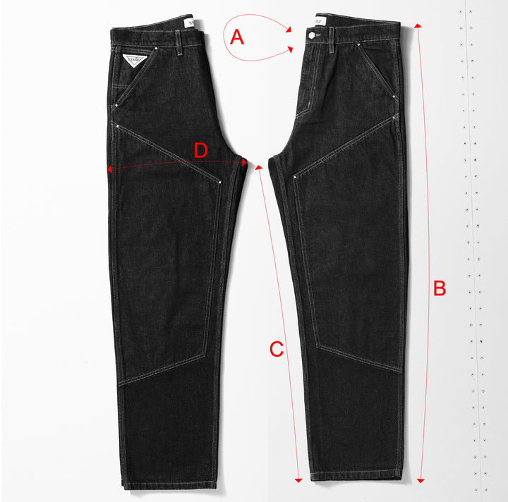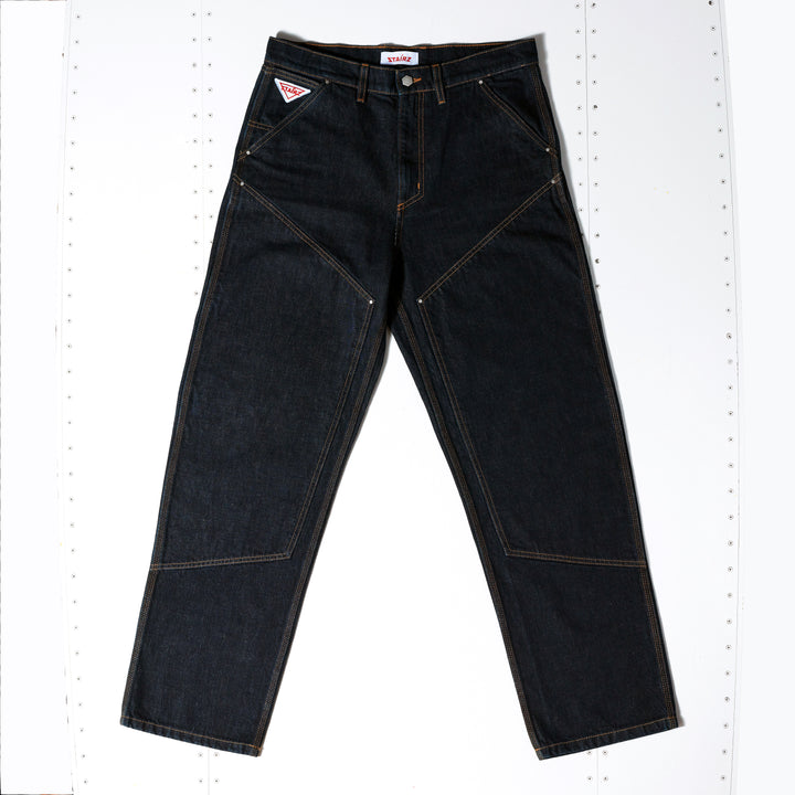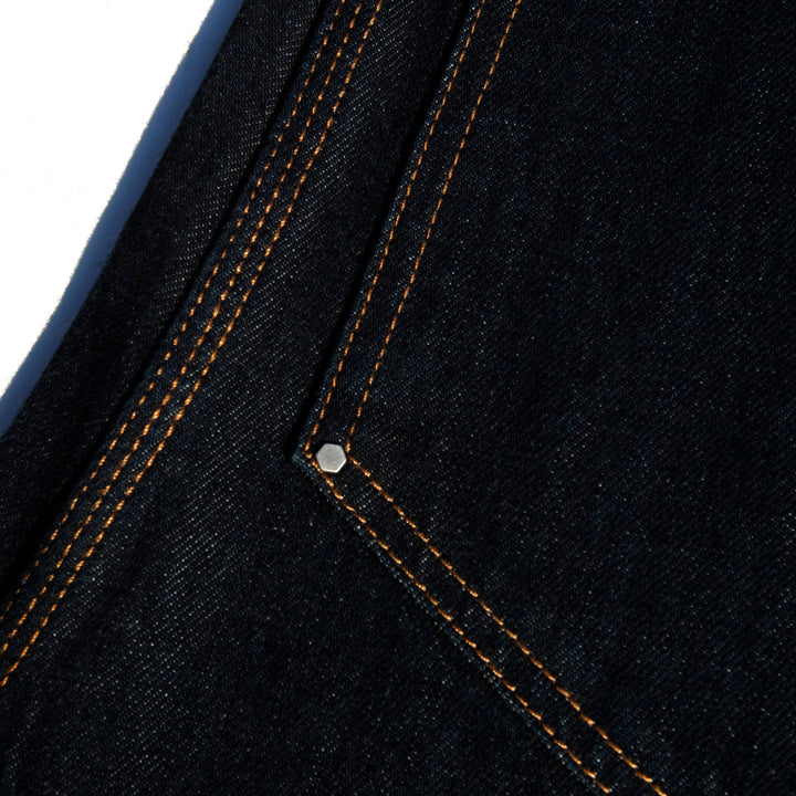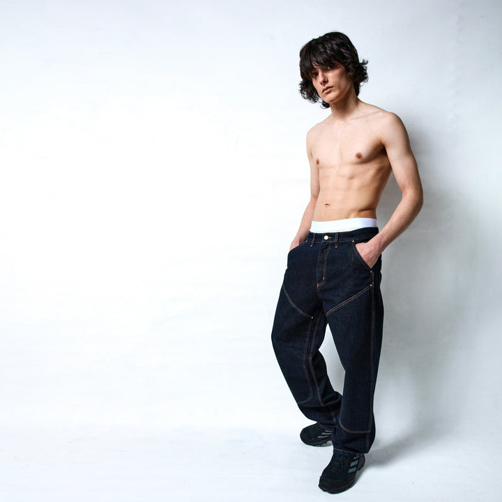 Jeans double knee in denim rigido 100% cotone, realizzati con ordito e trama cardati ad anello.